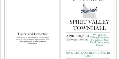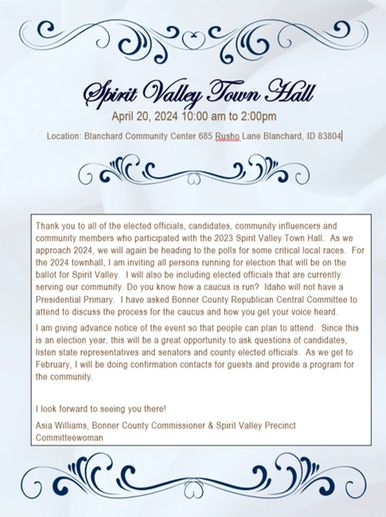 Save the date. 2024 townhall will feature current elected officials and people running for office that will be on the Spirit Valley Ballot.