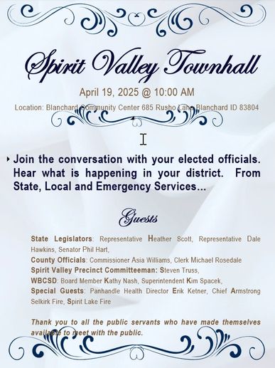 Join your elected state, county and local officials at our spirit valley townhall. We will also have our WBCSD board member and superintendent and representatives from fire to speak to us about the current Levy requests.